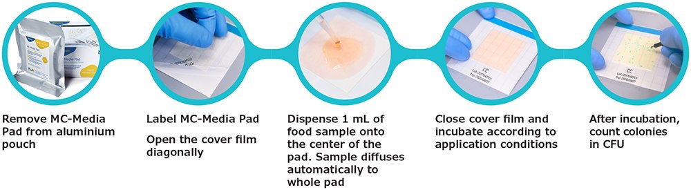 With our new MC-Media Pads we have extended our range of culture media, offering you a convenient alternative to traditional media methods. The pads are designed for convenient and reliable indicator organism testing of E.coli, Yeast and Mold, Coliform, Staphylococcus aureus, or aerobic microbial contamination in food and beverage products. While improving your workflow, they ensure accurate and reliable results. The color coding means you will always pick the right one at a glance.